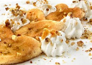 Banany obrać pokroić skośnie w plastry. Każdy plaster obtoczyć w cukrze wymieszanym z kakałem.  Śmietanę ubić na sztywno. Na półmisku ułożyć plastry bananów, obłożyć ozdobnymi kleksami bitej śmietany, posypać posiekanymi orzechami.