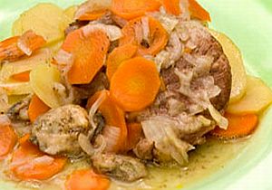 Mięso umyć, osuszyć, podzielić na porcje. Warzywa obrać, opłukać, pokroić w plastry. W nasmarowanym olejem naczyniu żaroodpornym układać warstwami mięso, warzywa, ponownie mięso i całość zwieńczyć warstwą warzyw. Każdą warstwę zrosić olejem i przyprawić. Naczynie przykryć. Piec w piekarniku nagrzanym do temperatury 180 stopni C przez około 2 godziny. Pod koniec pieczenia na kilka minut zdjąć pokrywę i podnieść temperaturę do 230 stopni.