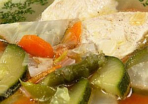 Cukinie, marchew, cebulę i selera obrać, pokroić w plastry. Fasolkę obrać, pokroić na kawałki długości około 5 cm. Filet z kurczaka pokroić w plastry. Warzywa podsmażyć na rozgrzanym oleju. W rondlu doprowadzić do wrzenia bulion drobiowy, dodać warzywa, gotować około 25 minut. Pod koniec gotowania dodać plastry mięsa. Podawać posypane zieleniną.