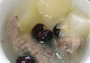 Owoce jujuby zalać zimną wodą na 15 minut, odcedzić. Melona obrać ze skóry, przekroić, usunąć gniazda nasienne, pokroić w kostkę o boku około 3 cm. Owoce jujuby i melon zalać wodą lub bulionem, doprowadzić do wrzenia, gotować powoli 15 minut. W osobnym rondlu zalać wrzątkiem pokrojone na porcje żeberka, gotować 15 minut, przełożyć do rondla z zupą. Zabieg ten ma na celu zapewnić pożądaną klarowność zupy. Gotować razem kolejne 40 minut, przyprawić i podawać. Należy zwracać uwagę na melon aby go nie rozgotować. Podane czasy są orientacyjne z uwagi na to że różne gatunki melona mogą mieć różny czas gotowania.