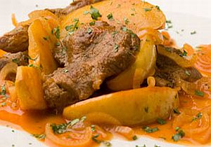 Cebulę obrać, pokroić w plastry. W rondlu rozgrzać 1 łyżkę masła, dodać cebulę, zeszklić mieszając. Umyte i osuszone mięso, podzielić na porcje, przyprawić solą, pieprzem i papryką. Na patelni rozgrzać połowę pozostałego masła, obrumienić na nim porcje mięsa. Na reszcie masła obsmażyć pokrojone na ósemki, pozbawione gniazd nasiennych owoce pigwy. Do rondla z cebulą dodać mięso, sok pomidorowy, dusić 15 minut, dodać pigwę i dusić nadal przez 5 minut. Zawartość rondla przełożyć na półmisek, posypać zieleniną i podawać.