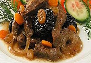 Śliwki i rodzynki dokładnie wypłukać, zalać wrzątkiem, odstawić na 60 minut. Marchewkę i cebulę obrać, pokroić w plastry. Mięso umyć, osuszyć, pokroić w grubą kostkę. W rondlu rozgrzać masło, dodać mięso, dusić pod przykryciem 5 minut. Dodać cebulę, marchewkę, przyprawy, dodać szklankę wrzącej wody, dusić 5 minut. Dodać odcedzone śliwki i rodzynki, dusić na małym ogniu aż mięso zmięknie, posypać zieleniną i podawać.