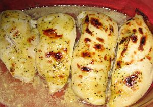 Wymieszać musztardę z wodą, dodać czosnek i zioła. Naczynie żaroodporne wysmarować oliwą, ułożyć w nim przyprawione piersi z kurczaka, piec przez 15 minut w piekarniku nagrzanym do temperatury 200 stopni C. Następnie obniżyć temperaturę piekarnika do 175 stopni C, mięso polać musztarda z dodatkami, wstawić do piekarnika na 15 minut. Podawać z ziemniakami piure i ulubionymi dodatkami.