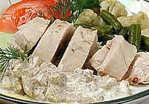 Kurczaka dokładnie umyć, osuszyć, przekroić na połówkę, przyprawić, na 2 godziny odstawić do lodówki. W dużym, płaskim rondlu doprowadzić do wrzenia wodę, dodać warzywa jak do rosołu, liść laurowy, ziele angielski, gotować 15 minut. Do wrzącego wywaru dodać kurczaka i powoli gotować30 do 40 minut. Schłodzić w wywarze,. Z ugotowanego, chłodnego kurczaka po zdjęciu skóry wykrawać kształtne plastry mięsa, układać na półmisku. Ze śmietany, tartego chrzanu, curry i utartego (lub pokrojonego w kostkę) na drobnej tarce jabłka przygotować sos i polać nim półmisek obok kurczaka. Udekorować zieleniną, dodać ewentualnie ulubione dodatki i podawać jako zimną zakąskę.