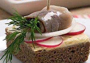 1. Chleb posmarować masłem, obłożyć plastrami rzodkiewki. Filety śledziowe zwinąć w rulon wkładając w środek gałązkę kopru. Filet ułożyć na kromce chleba z rzodkiewką, przypiąć wykałaczką.