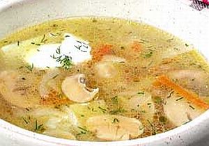 Grzyby oczyścić, pokroić w plastry. Na patelni rozgrzać olej, dodać pokrojone grzyby, smażyć mieszając aż zaczną się rumienić. W rondlu doprowadzić do wrzenia wywar mięsny, dodać pokrojoną kapustę, liście laurowe, pieprz, zeszkloną na oleju pokrojoną w piórka cebulę, obraną marchewkę i pietruszkę pokrojone w słupki. Gotować powoli aż kapusta zmięknie, dodać grzyby. Śmietanę, kilka łyżek wody wymieszać z mąką, dodać do zupy. Przed podaniem posypać zieleniną.