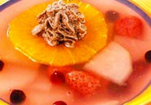 Jabłko i gruszkę obrać, pokroić w plastry, usunąć gniazda nasienne, skropić sokiem z cytryny. Plastry owoców zalać 3 szklankami wody, gotować 15 minut, wywar odcedzić do rondla. Wywar doprowadzić ponownie do wrzenia, dodać cukier, pokrojone na kawałki plastry jabłka i gruszki, jagody i gotować kolejne 5 minut. Mąkę ziemniaczaną rozprowadzić zimną wodą, dodać do zupy, mieszając poczekać, aż zacznie wrzeć. Podawać na zimno lub gorąco udekorowane plastrami pomarańczy i śmietaną.