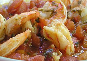 Na patelni rozgrzać oliwę, dodać czosnek, smażyć 2 minuty mieszając. Dodać pomidory i pozostałe składniki sosu, dusić mieszając około 8 minut, przyprawić pikantnie. Do przygotowanego sosu dodać umyte odwłoki krewetek i dusić razem 4 minuty. Podawać na gorąco.