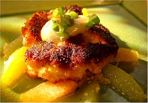 W misce wymieszać krewetki, posiekane drobno białe części cebulek, sos Aioli, sól i pieprz. Dolanie wymieszać. Dodać tartą bułkę w takiej ilości aby powstałe „ciasto” pozwoliło się formować nieduże, okrągłe ciasteczka. Na patelni rozgrzać olej, smażyć przygotowane ciasteczka po około 4 minuty z każdej strony. W międzyczasie wymieszać części cytrusów z mielonym imbirem i pokrojonym drobno zielonym szczypiorem, przyprawić lekko solą i pieprzem. Podając sformować z sałatki kopczyk, na nim ułożyć ciasteczka z krewetek udekorowane kleksem sosu Aioli.