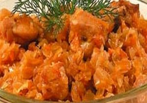 Mięso umyć, osuszyć, podzielić na porcje. Kapustę pokroić na krótsze kawałki, zalać wodą, doprowadzić do wrzenia, odcedzić. Ponowione zalać wodą i gdy zawrze odcedzić. W międzyczasie w rondlu rozgrzać masło, dodać obraną i pokrojoną cebulę, lekko ją zeszklić, dodać kawałki mięsa, chwilę smażyć mieszając, dodać koncentrat pomidorowy, smażyć jeszcze 1 minutę mieszając. Do zawartości rondla dodać kapustę, wodę, kostkę rosołową i dusić aż woda odparuje, a składniki zmiękną.