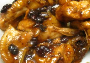 Cukier wymieszać z octem winnym i wodą. W dużym rondlu ułożyć podzielonego na porcję kurczaka, dodać ocet z dodatkami, liść laurowy, gotować 15 minut. Dodać sos sojowy i powoli gotować kolejne 30 minut. Przed końcem gotowania dodać wypłukaną czerwoną fasolę. Powstały sos powinien być gęsty i mieć wyraźny smak. W miarę potrzeby skorygować smak przyprawami.