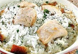 Ryż zalać 3 szklankami bulionu drobiowego, dodać 3 dkg masła, przyprawy, gotować powoli uważając aby nie przywarł. Chleb pokroić w kostkę. Na patelni rozgrzać 1 łyżkę masła, obrumienić na nim kostki chleba. W naczyniu żaroodpornym wysmarowanym masłem ułożyć przyrumieniony chleb, polać rosołem, na nim ułożyć ryż, a na ryżu pokrojone piersi z kurczaka. Całość polać kefirem, rozłożyć na nim resztę masła i posypać natką pietruszki. Zapiekać w piekarniku nagrzanym do temperatury 180 stopni C. Podawać gorące.