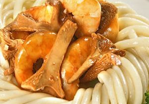 Grzyby oczyścić, pokroić w plastry. Na patelni rozgrzać masło, dodać grzyby, dusić 10 minut. Dodać krewetki, obrany i posiekany czosnek, przyprawy, smażyć kolejne 5 minut mieszając. Makaron ugotować wg przepisu producenta, odcedzić, ułożyć ozdobnie na półmisku, na środek nałożyć krewetki z grzybami. Udekorować zieleniną i podawać.