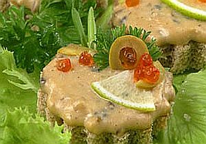 Na rozgrzanym maśle zeszklić pokrojoną drobno cebulę, wyjąć i odłożyć.  Na pozostałym tłuszczu obrumienić oczyszczone i pokrojone drobno pieczarki. . Cebulkę, żółtka jaj, łososia zmiksować dokładnie, dodać pieczarki, śmietanę, przyprawy, wymieszać ponownie. Pieczywo pokroić ozdobnie na małe kawałki, na każdy nałożyć mus, ozdobić cytryną, kawiorem i kawałkami oliwek. Półmisek wyłożyć listami sałaty na nich ułożyć kanareczki i podawać.