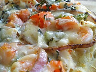 Na posmarowanym sosem spodzie rozłożyć wszystkie składniki, posypać tartym serem. Pizzę z dodatkami pieczemy w piekarniku nagrzanym do 220°C ( elektr.195°C ) przez 15-20 min.