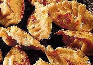 Składniki sosu dokładnie wymieszać, odstawić w chłodne miejsce. Ugotowane wcześniej i schłodzone pierożki zrosić olejem, wymieszać. Tak przygotowane pierożki układać na aluminiowych tackach i piec na mocno nagrzanym grillu rumieniąc z obu stron. Podawać gorące z przygotowanym sosem.