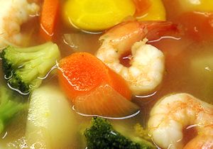 W dużym rondlu rozgrzać 1 łyżkę oliwy, dodać czosnek i cebulę, smażyć mieszając 3 minuty, dodać pomidory, smażyć kolejne 2 minuty. Dodać bulion, liść laurowy, ziemniaki, marchewkę, gotować powoli aż będą miękkie. Dodać krewetki i brokuły, przyprawić pikantnie i powoli gotować 3 do 5 minut aż krewetki zrobią się różowe. Dodać sok cytrynowy, wymieszać, dodać natkę i podawać.
