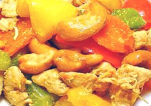 Umyte i osuszone piersi z kurczaka pokroić w kostkę o boku 2 cm. Podobnie pokroić obraną i oczyszczoną z nasion paprykę. Obraną marchewkę i łodygi selera pokroić w odcinki o długości 2 cm. Na dużej patelni rozgrzać olej, dodać czosnek, smażyć 2 minuty, dodać pokruszone papryczki chili, smażyć 30 sekund, dodać kurczaka i smażyć aż zmieni kolor. Do tak podsmażonego kurczaka dodać warzywa i przyprawy, smażyć mieszając około 4 minuty, dodać orzeszki, wymieszać i po minucie podawać. Znakomitym dodatkiem będzie ryż. Osoby nie przepadające za zbyt pikantnymi potrawami mogą oczyścić papryczki chili z nasion. Polecam, pychota.