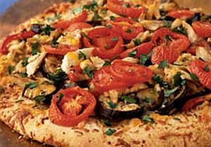 Na patelni rozgrzać oliwę, dodać cebulę i czosnek, chwilę smażyć mieszając, dodać paprykę i bakłażana, smażyć 3 minuty, dodać grzyby, smażyć razem kolejne 3 minuty, przyprawić. Na posmarowanym sosem spodzie pizzy rozłożyć równomiernie zawartość patelni, a na niej plastry pomidora i plastry mięsa. Posypać natką pietruszki i serem.Pizzę z dodatkami pieczemy w piekarniku nagrzanym do 220°C ( elektr.195°C ) przez 15-20 min.