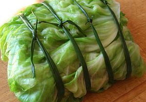 Polędwiczki oczyścić z błon, przyciąć aby były równej długości, przyprawić solą i pieprzem, oprószyć ziołami, odłożyć na 30 minut. Z liści kapusty ściąć grube żyły. W rondlu doprowadzić do wrzenia wodę, obgotować w niej przez 3 do 5 minut liście kapusty. Liście wyjąć z wrzątku, schłodzić, osuszyć. Blanszować w pozostałej w rondlu