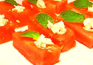 Arbuza pokroić w plastry, usunąć pestki, pociąć w nieduże sześciany. Małą łyżeczką deserową w każdym kawałku arbuza wykonać wgłębienie które wypełniamy serem feta. Tak przygotowaną przekąskę układamy na półmisku i odkładamy w chłodne miejsce. Przed podaniem każdy kawałek dekorujemy listkami mięty i wbijamy weń wykałaczkę.