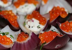 Cebulę obrać, podzielić wzdłuż na połowę lub 3 części. Każdą część podzielić na warstwy. Przez minutę blanszować we wrzątku z solą i octem, odcedzić, osuszyć. Twaróg wymieszać z wędzonym łososiem. Do każdej „czarki” z cebuli nakładać twarożek z łososiem i kawior. Posypać koperkiem i grubo mielonym pieprzem. Przed podaniem schłodzić.