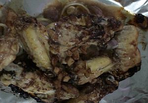 Kurczaka umyć, osuszyć, podzielić na mniejsze kawałki. Na podwójnym płacie foli aluminiowej ułożyć cebulę, kurczaka i pozostałe składniki. Dodać przyprawy, oliwę i olej sezamowy. Całość zawinąć szczelnie. Piec 25 minut w temperaturze 190 stopni C. Ostrożnie odwinąć po upieczeniu. Podawać z frytkami, ryżem, pieczywem…