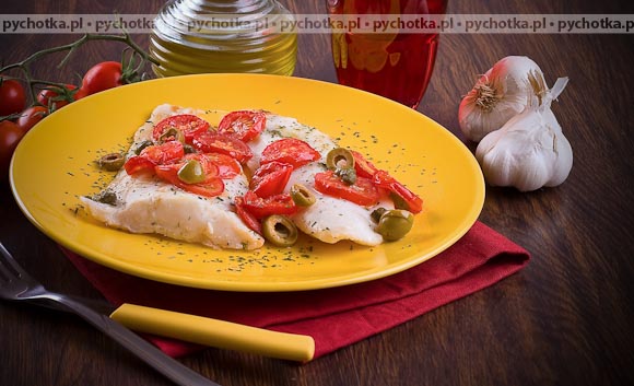 Filety umyć, osuszyć, skropić sokiem z cytryny, przyprawić solą i pieprzem. Na odpowiednio dużym kawałku folii ułożyć przygotowane porcje ryby, obłożyć je pomidorami i oliwakmi, posypać czosnkiem. Na każdej położyć 1 łyżeczkę masła. Folię zawinąć tworząc szczelny pakiet. Piec na dobrze nagrzanym grillu przez 5 minut, folię ostrożnie rozwinąć i piec kolejne 8 minut aż nadmiar sosu odparuje.