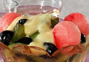 Wiinnegrona przekroić na połowę, ewentualnie usunąć pestki. Gruszki obrać ze skóry, usunąć gniazda nasienne, pokroić wzdłużnie na ósemki, skropić sokiem z cytryny. Kiwi obrać ze skóry, pokroić w plastry. Z miąższu arbuza po usunięciu pestek wykrawać łyżeczką kulki. Jogurt ewentualnie posłodzić, dodać cukier waniliowy i cynamon, zmiksować. W salaterce ułożyć owoce, polać przygotowanym jogurtem.