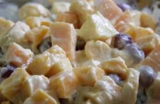 Owoce umyć po czym pokroić w kostkę skropić sokiem z cytryny, dodać rodzynki. Wszystko wymieszać z sosem: (zmiksowany banan wymieszany z jogurtem naturalnym i 2 łyżkami cukru). Po wymieszaniu ozdobić z wierzchu bitą śmietaną i migdałami.