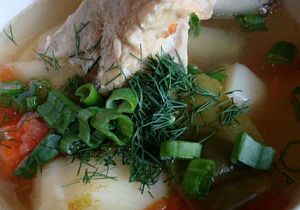Mięso bardzo dokładnie wypłukać, podzielić na 4 porcje. W dużym rondlu zalać żeberka wodą, doprowadzić do wrzenia, usunąć wytwarzającą się pianę. Cebulę obrać, przekroić na połowę, jedną połowę dodać do gotującego się mięsa. Rondel przykryć pokrywką, powolutku gotować 50 minut. W międzyczasie obrać marchew, pokroić w skośne plastry, Pozostałą połowę cebuli pokroić wzdłuż na 4 części, pomidora obrać ze skóry, pokroić w ćwiartki. Paprykę oczyścić z nasion, grubo pokroić. Ziemniaki obrać, pokroić na połowę.  Z wywaru usunąć cebulę, dodać pozostałe składniki, przyprawić pikantnie gotować 40 minut. Przed podaniem obficie posypać zieleniną.