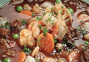 Fasolę wypłukać, zalać wodą, odstawić na 12 godzin. Namoczoną fasolę ugotować w wodzie w której się moczyła. W rondlu rozgrzać olej, dodać cebulę, chwilę smażyć mieszając, dodać mięso, smażyć aż zbrązowieje, zalać bulionem, powoli gotować. Marchewkę obrać, pokroić w plastry. Różyczki kalafiora starannie opłukać, dodać wraz z marchewką do rondla, gotować aż składniki zmiękną. Dodać odcedzoną fasolę, pastę pomidorową i zielony groszek, gotować jeszcze 2 minuty. Przed podaniem skorygować smak zupy i posypać zieloną pietruszką.