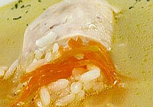Umyte mięso zalać w rondlu zimną wodą, doprowadzić do wrzenia, gotować powoli około 1 godziny. Mięso wyjąć, usunąć kości. Mięso pokroić na kawałki. Obraną marchew i cebulę pokroić w słupki. Na patelni rozgrzać 1 łyżkę oleju, dodać marchew i cebulę, smażyć kilka minut mieszając, nie rumienić. Zawartość patelni przełożyć do rondla z bulionem z kurczaka, dodać ryż, gotować aż zmięknie. Pod koniec gotowania dodać mięso z kurczaka. Przed podaniem posypać zieleniną.