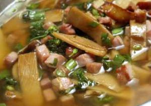 Makaron sparzyć wg przepisu na opakowaniu, odcedzić, polać sosem sojowym, dokładnie wymieszać, podzielić w miseczkach na porcje, odstawić w ciepłe miejsce. Grzyby zalać wrzątkiem, a gdy zmiękną odciąć trzony, kapelusze pokroić w paseczki. W rondlu rozgrzać olej, dodać pokrojone w paseczki lub kostkę mięso, pędy bambusa, połowę posiekanej cebulki, szpinak, grzyby, smażyć mieszając 3 minuty, przyprawić, wymieszać. Do rondla dodać bulion drobiowy, doprowadzić do wrzenia, skorygować ewentualnie smak przyprawami. Dodać resztę zielonej cebulki i podawać z przygotowanym wcześniej makaronem.