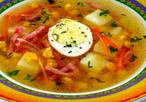 Ziemniaki obrać, pokroić w kostkę, zalać bulionem, powoli gotować Marchewkę, cebulę i szynkę pokroić w „słomkę”. Na patelni rozgrzać masło, zeszklić na nim cebulkę, dodać marchew i szynkę, chwile razem dusić, dodać do bulionu. Zupę przyprawić, dodać kukurydzę, gotować jeszcze 5 minut. Przed podaniem możemy do zupy dodać gotowane jajko oraz obficie posypać nacią.