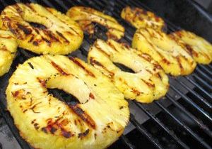 Ananasa oczyścić, pokroić w plastry. Składniki marynaty zmiksować. Plastry ananasa posmarować marynatą, odstawić na kilkanaście minut. Piec na dobrze nagrzanym grillu około 4 minut obracając i smarując pozostałą marynatą. Opieczone plastry skropić rumem i oprószyć otartą z cytryny skórką.