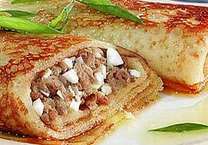 Do miski wybić jajka, 1 szklankę piwa i sól, zmiksować na gładką masę, dodać resztę piwa, ponownie zmiksować. Gorącą patelnię cienko nasmarować tłuszczem (kawałkiem słoniny nabitym na widelec), wlać ciasto, poruszając patelnia rozprowadzić ciasto na całej powierzchni patelni. Smażyć do momentu aż ciasto zacznie odstawać na brzegach, obrócić i dopiec. Wykładać na talerz odwrócony do góry dnem. Mięso pokroić w kostkę. Na patelni rozgrzać masło, dodać mięso, obrumienić, dodać cebulę, smażyć mieszając aż cebulka się zeszkli, podlać kilkoma łyżkami wody, dusić aż mięso zmięknie, schłodzić. Mięso z cebulą zmielić w maszynce, dodać jajka, śmietanę, natkę, przyprawy, dokładnie wymieszać. Tak przygotowany farsz rozkładać na naleśnikach i zwijać je zamknięty rulon ( dwa brzegi przed zwinięciem w rulon podwinąć do środka). Przed podaniem można obsmażyć co znakomicie poprawia smak.